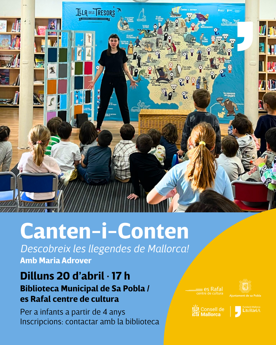 Us convidam a un Contacontes de petit format a càrrec de Maria Adrover, actriu i música. Com a gran narradora, Maria ens contarà algunes de les llegendes més especials de Mallorca, desvetllant els secrets dels personatges que les protagonitzen i els llocs on aquestes històries han arribat fins als nostres dies.