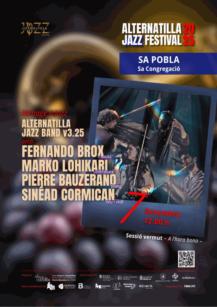 Aquest matí a Sa Pobla, el quartet reuneix la flauta flexible i imaginativa de Fernando Brox (formació clàssica, gir jazzístic i llançament recent a Fresh Sound), el contrabaix càlid de Marko Lohikari, el piano líric del pianista francès Pierre Bauzerand i la veu-violí de Sinéad Cormican, mallorquina d’arrels irlandeses entre el clàssic i el jazz. Quatre veus que es troben per primera vegada sota el paraigua Alternatilla.