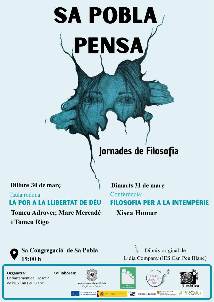 El Departament de Filosofia de l’IES Can Peu Blanc organitza enguany les primeres Jornades filosòfiques Sa Pobla Pensa. Seguint l’impuls d’altres experiències i volen treure la Filosofia al carrer i acostar-la a tots els públics. Els dies 30 i 31 de març l’alumnat de primer de batxillerat del centre participaran a tallers en diversos espais municipals. I els capvespres ens conviden a la reflexió a tota la ciutadania amb una taula rodona i una conferència a Sa Congregació a les 19 h.