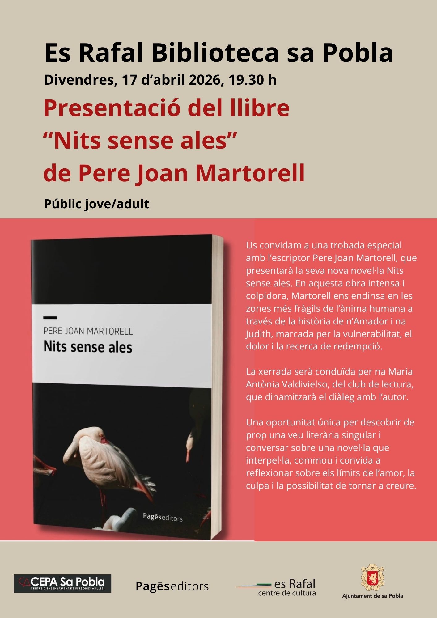 Us convidam a una trobada especial amb l’escriptor Pere Joan Martorell, que presentarà la seva nova novel·la Nits sense ales. En aquesta obra intensa i colpidora, Martorell ens endinsa en les zones més fràgils de l’ànima humana a través de la història de n’Amador i na Judith, marcada per la vulnerabilitat, el dolor i la recerca de redempció.