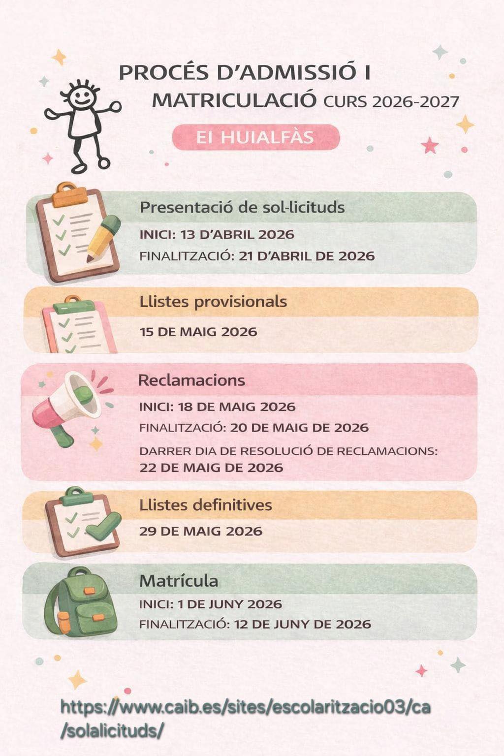 L’Ajuntament de sa Pobla informa que del 13 al 21 d'abril estarà obert el període de presentació de sol·licituds per a l’escolarització dels infants de 0 a 3 anys per al curs 2026-2027.